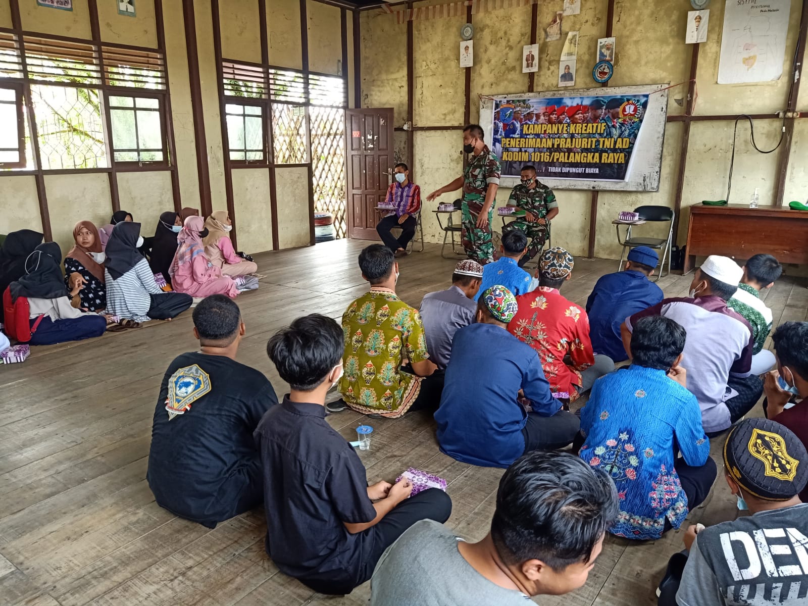 PALANGKA RAYA, KALATENGKITA.COM – Kodim 1016 Palangka Raya melalui Staf Personel (Staf Pers) menggelar kampanye kreatif penerimaan Bintara dan Tamtama Prajurit Karier (PK) Tentara Nasional Indonesia (TNI) Angkatan Darat (AD) yang bersumber dari para santri dan lintas agama di Pondok Pesantren (Ponpes) Hidayatul Insan, Jalan Sulawesi, Kelurahan Pahandut, Kecamatan Pahandut, Kota Palangka Raya, Rabu (9/3/2022).