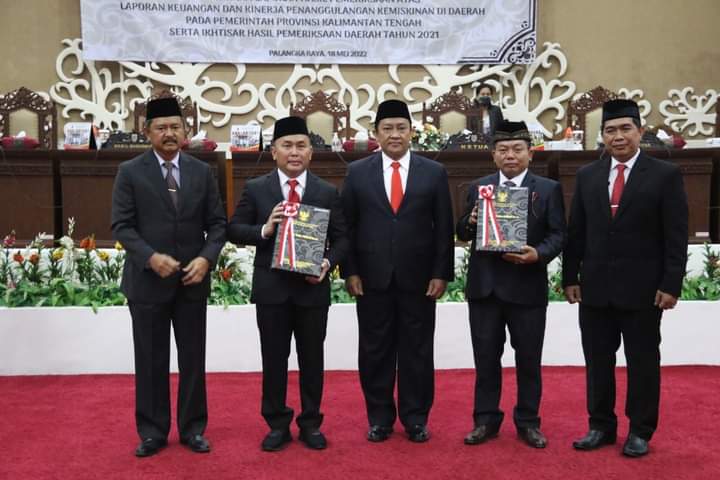 PALANGKA RAYA, KALTENGKITA.COM-Gubernur H. Sugianto Sabran menerima penyerahan Laporan Hasil Pemeriksaan (LHP) dari Badan Pemeriksa Keuangan (BPK) RI atas Laporan Keuangan Pemerintah Provinsi Kalimantan Tengah (Pemprov Kalteng) Tahun Anggaran (TA) 2021 dalam Rapat Paripurna ke-8 Masa Persidangan I Tahun 2022, bertempat di Ruang Rapat Paripurna DPRD Provinsi Kalimantan Tengah, Rabu (18/5/2021).